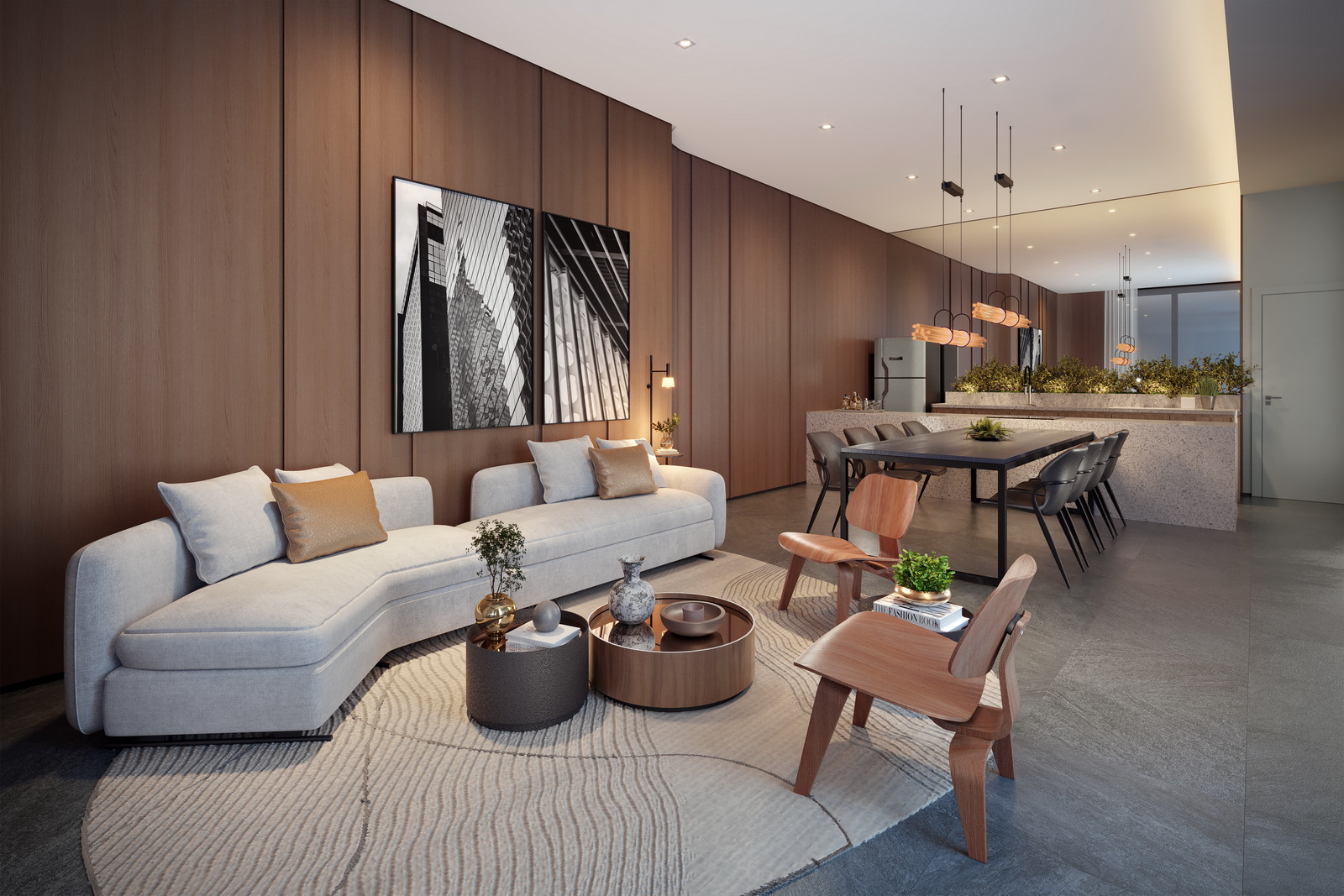 Nosso ponto de partida foi traduzir a essência cosmopolita de Nova York. A madeira escura imprime acolhimento e sofisticação, em contraste com o cinza que evoca o concreto urbano.
